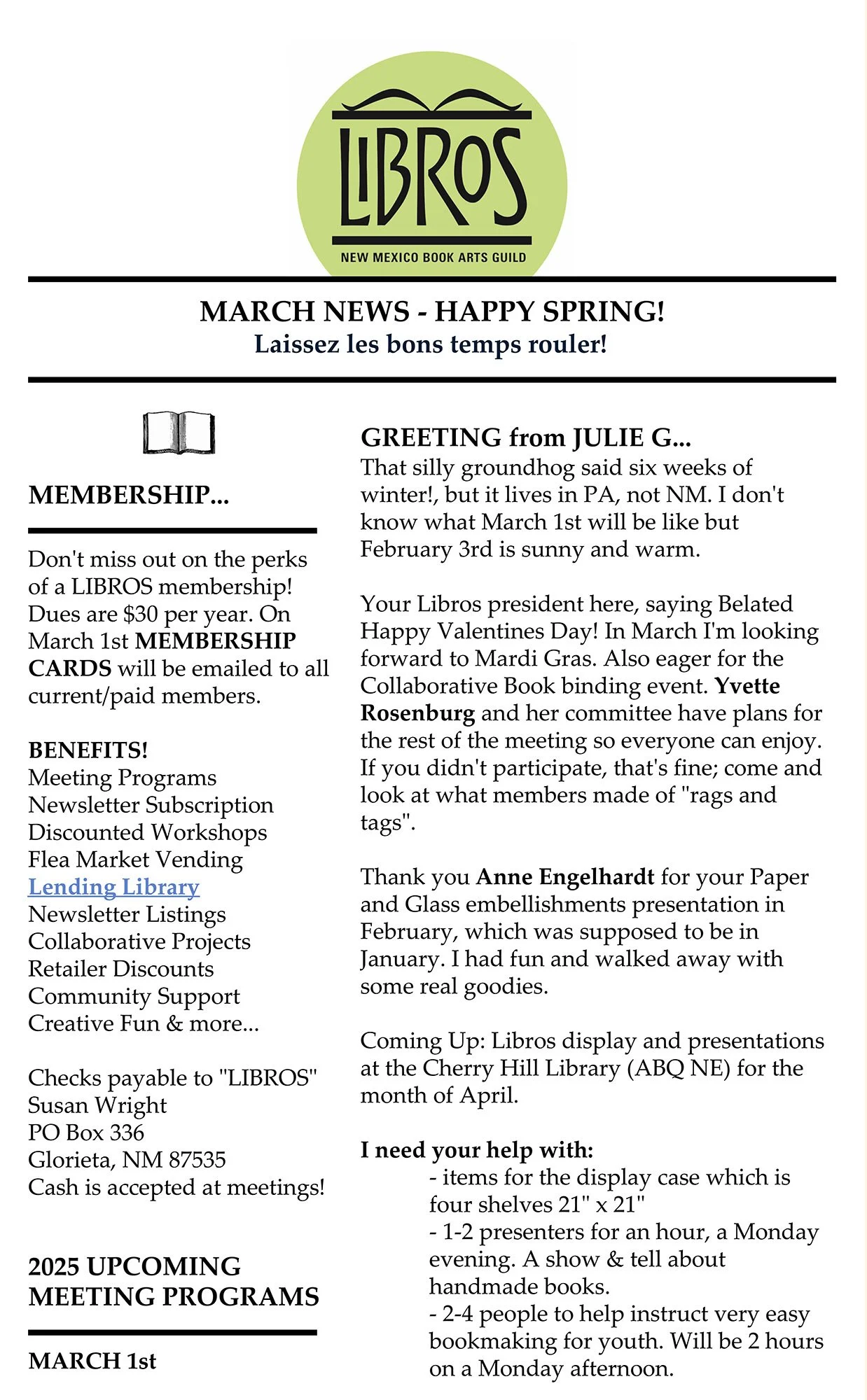 One of the benefits of being a Libros Member is receiving the monthly newsletter.